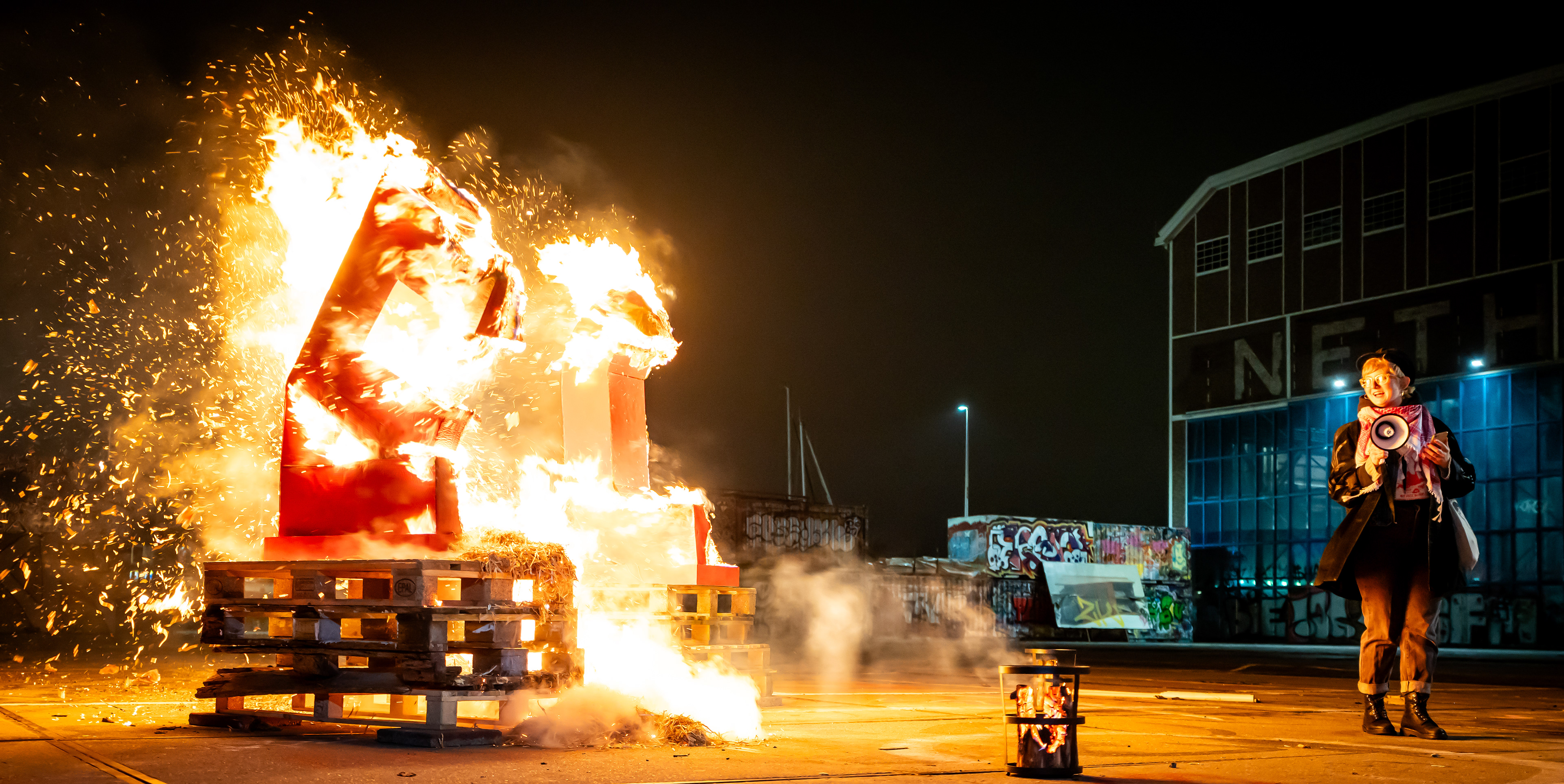 Actievoerders van Exctinction Rebellion lopen een mars naar de Eerste Kamer. XR voert sinds 2022 acties waarbij de snelweg A12 geblokkeerd wordt, waarmee een einde aan de fossiele subsidies geëist wordt. ANP KJELL HOEXUM